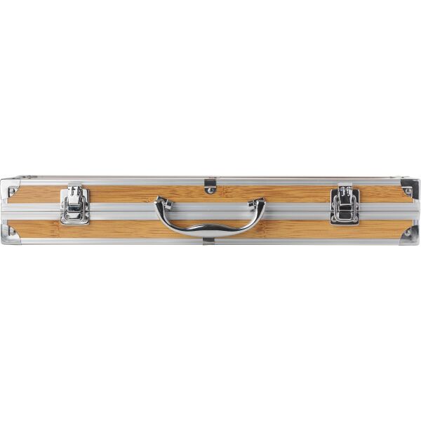 Driedelige barbecueset in aluminium koffer met bamboe print, inclusief: vork, spatel en tang.