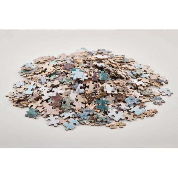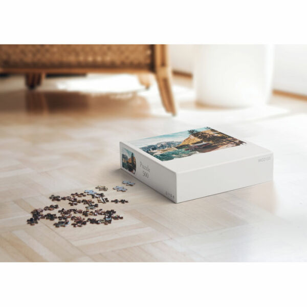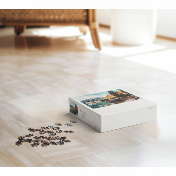 Puzzel van 500 stukjes. Gepresenteerd in een doos. De puzzel en de doos hebben een standaard design en deze kan niet aangepast worden.