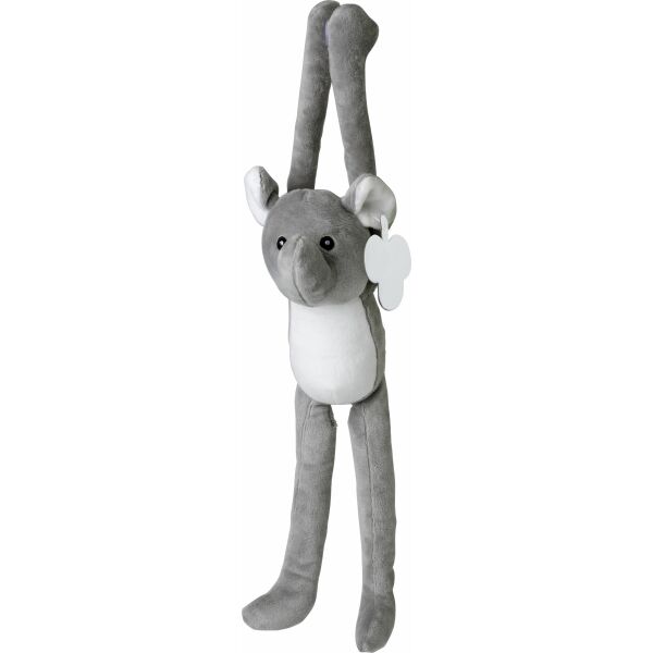 Pluche olifant met lange armen en klittenbandsluiting. Geborduurde ogen. Inclusief kartonnen label voor bedrukking.