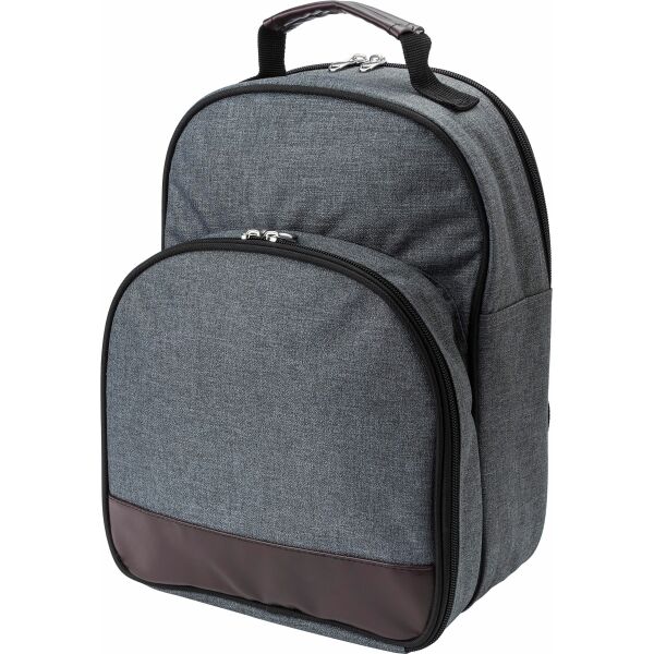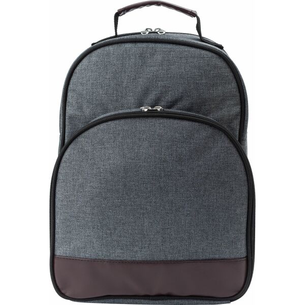 Polycanvas (600D) picknick koelrugtas met aluminium folie binnenkant. Hoofdvak en voorvak met kunststof bestek, mokken en borden voor twee personen. De schouderbanden zijn verstelbaar.