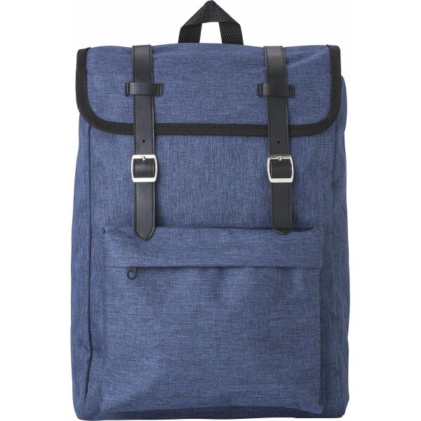 Polyester (300D + 210D) rugzak met voorvak. De flap sluit met twee metalen gespen. De rug en schouderbanden zijn gewatteerd en de schouderbanden zijn verstelbaar.