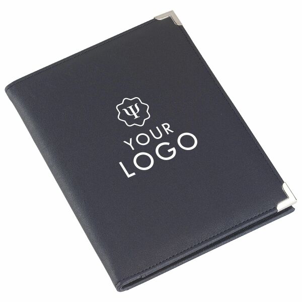 PU documentenmap (A5), met metalen hoeken en diverse insteekvakken, excl. schrijfblok en pen. De blauwe versie bevat zilveren hoeken, de zwarte versie bevat gouden hoeken.
